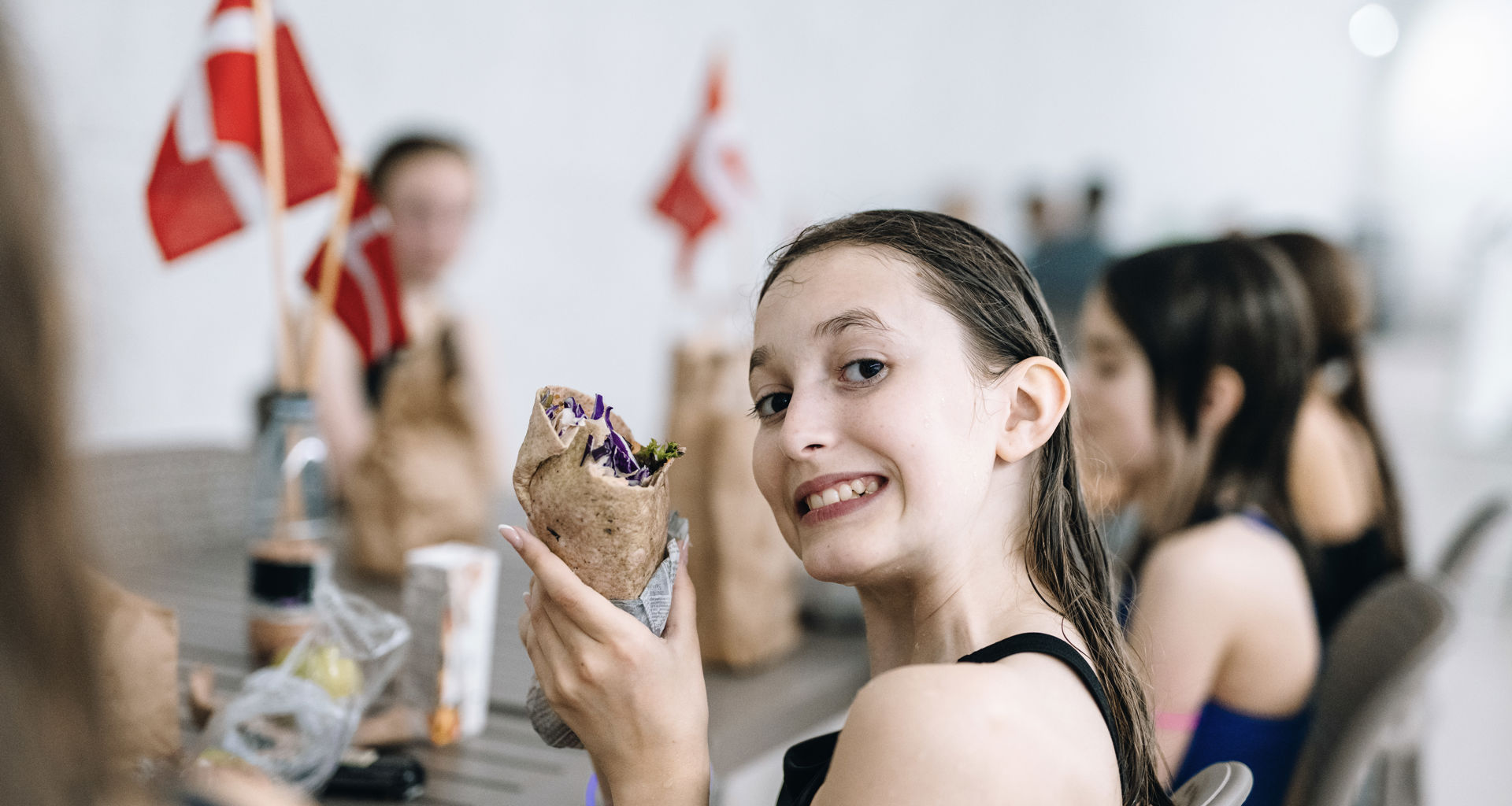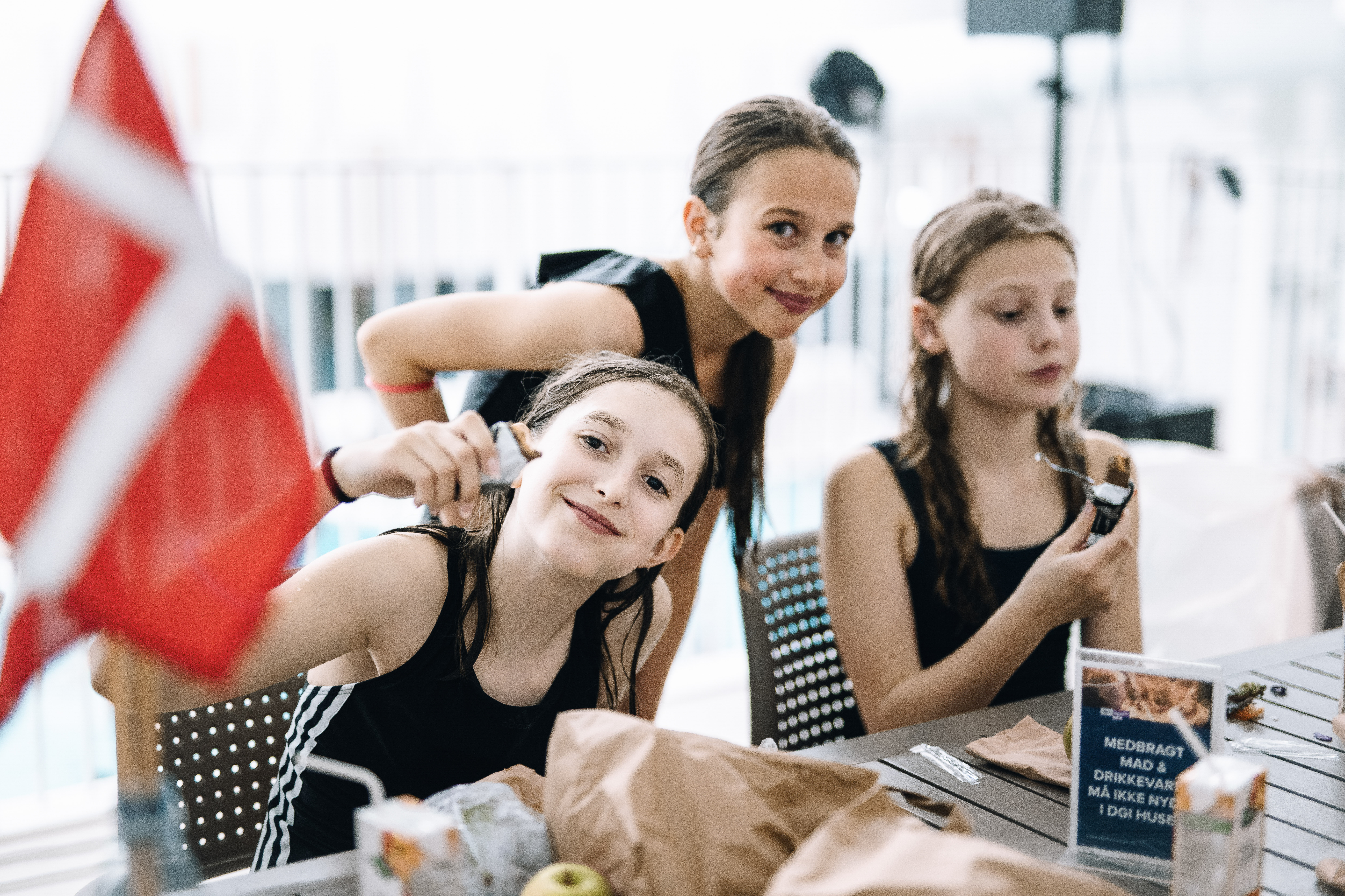 Kl. 13.00: Maden serveres på balkonen i svømmehallen.