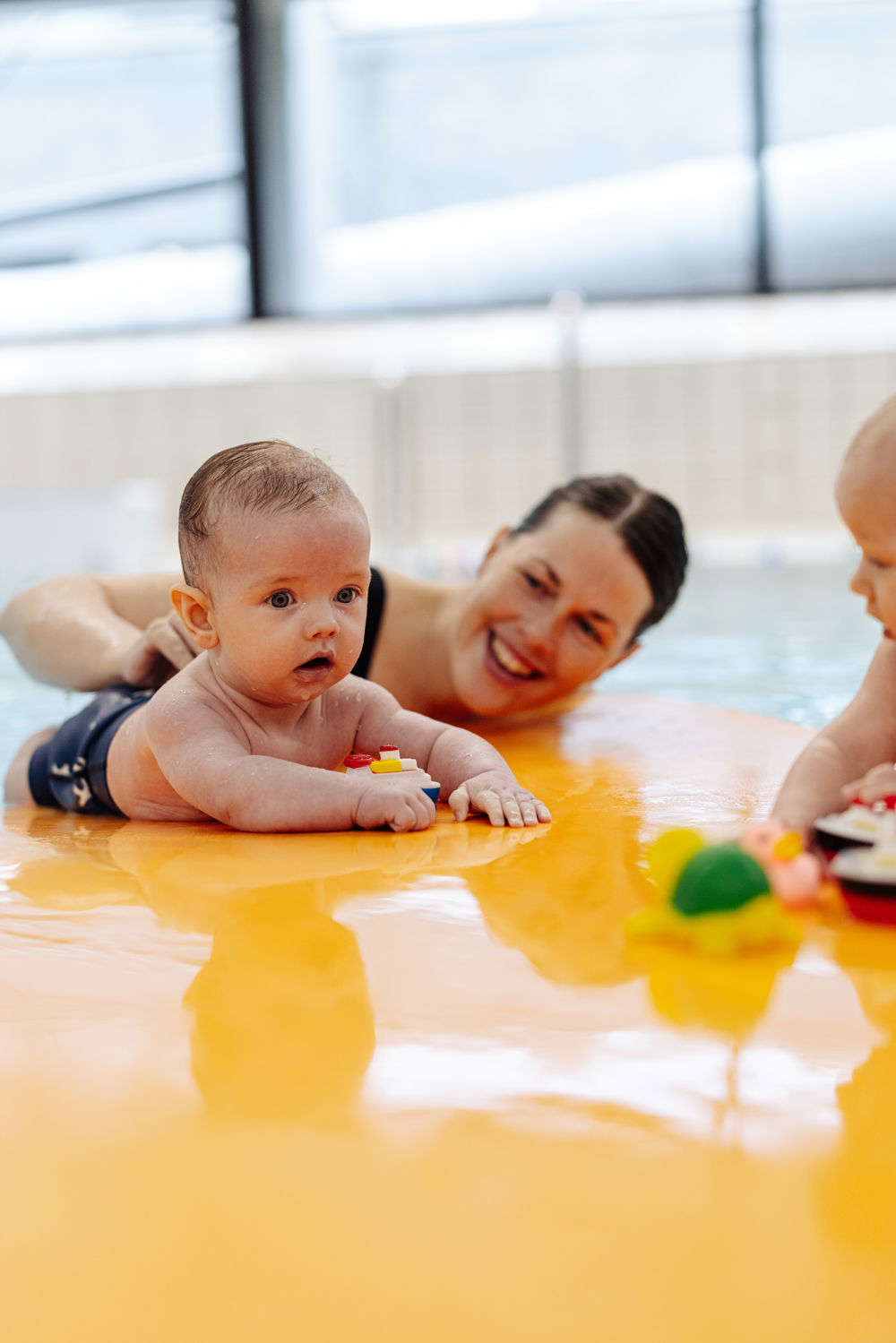 På holdet laver vi små øvelser, synger og leger med farverige redskaber, præcis som til babysvømning. Imens bevæger fotografen sig diskret rundt som en flue på væggen og tager stemningsfulde billeder af jer i vandet. Det giver både en dejlig oplevelse her og nu og minder, I kan glæde jer over længe efter.