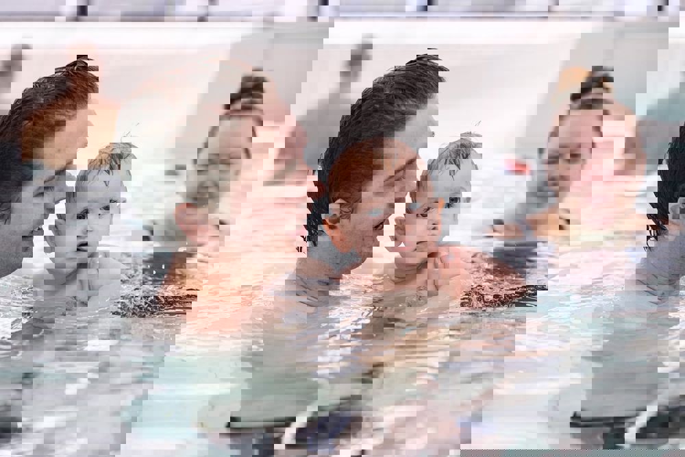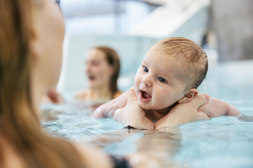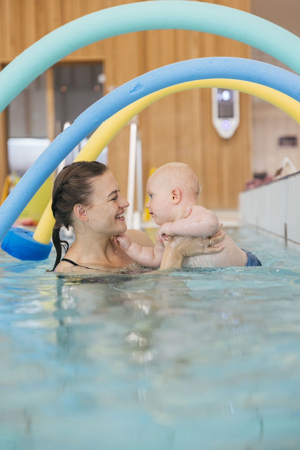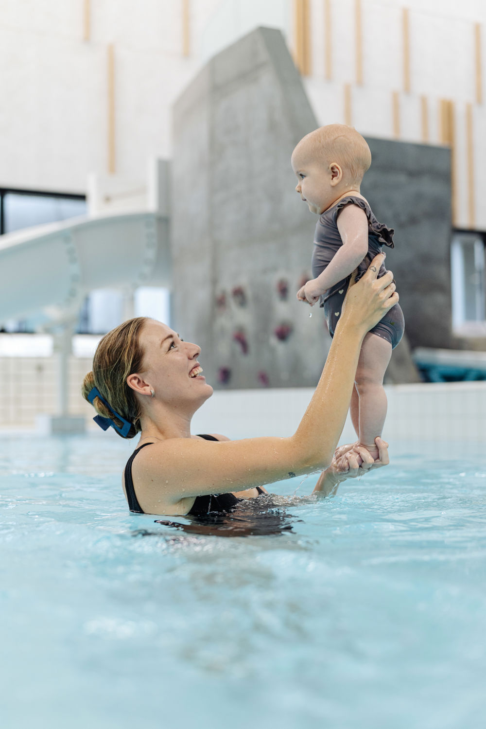 I deltager i en hyggelig stund med babysvømning, hvor der leges, synges og laves små øvelser i vandet. Imens tager fotografen stemningsfulde billeder undervejs.