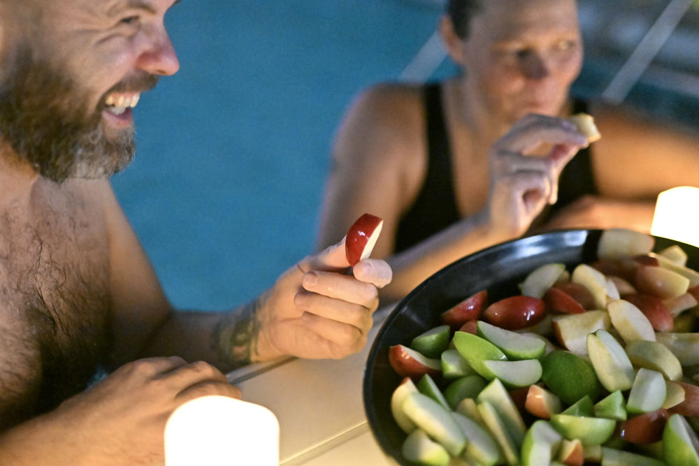 I løbet af aftenen kan du nyde saunagus, infrarød sauna, spabad og isbad. Mellem aktiviteterne serveres let forplejning med frisk frugt, småkager, kaffe, te og isvand. Aftenen afsluttes med en lille overraskelse, som sætter prikken over i’et på en stemningsfuld og afslappende oplevelse.